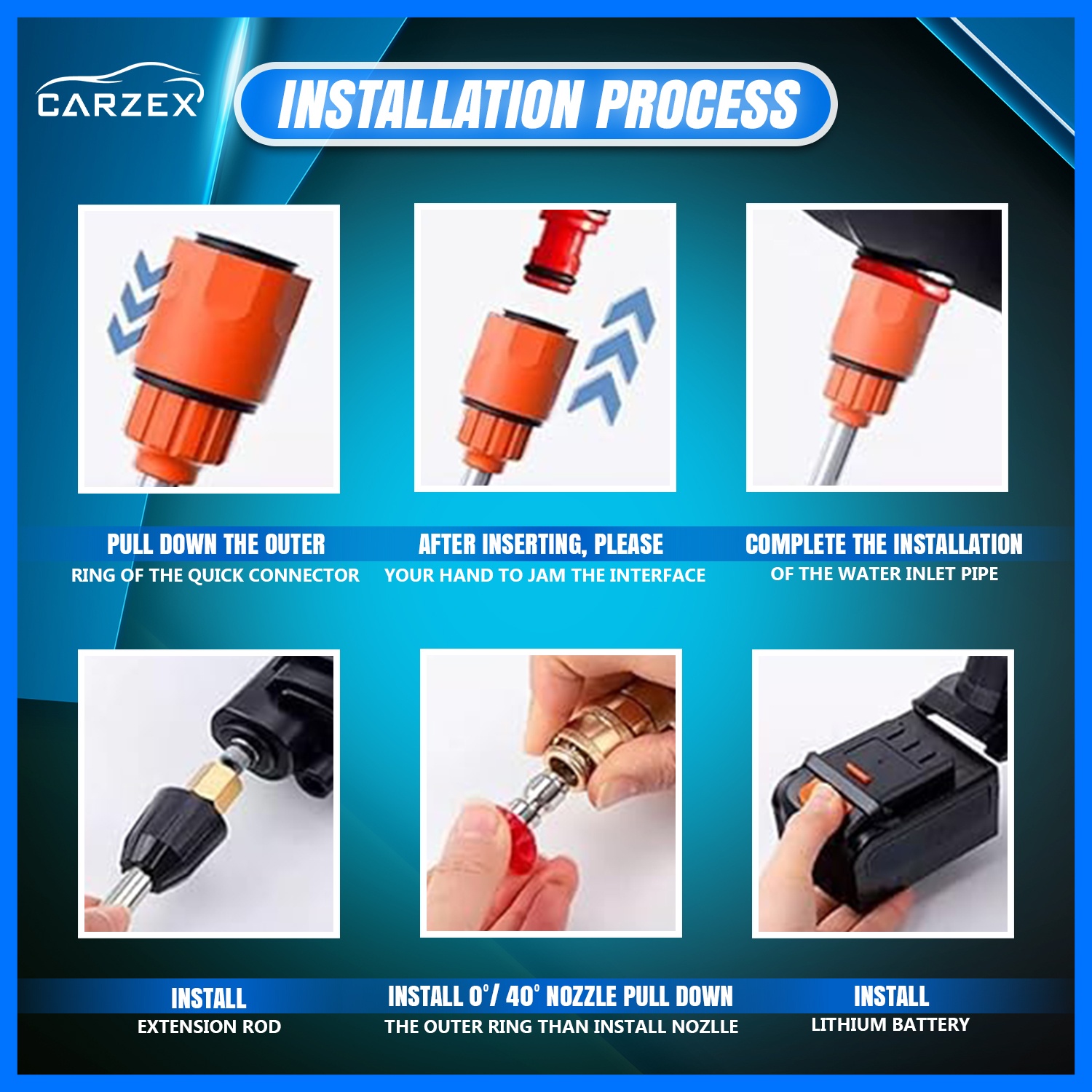 Carzex 48V High Power Wireless Pressure Washer Machine for Car, Bike & Home Cleaning with Adjustable 3in1 Nozzle & 5M Hose Pipe, 12000 mAh Rechargeable Machine Comes with a 5M long garden hose allow you to draw water from any fresh water source like a pool, lake, or bucket and . You can hook up to a garden hose at the house or even a 2L bottle on the go.