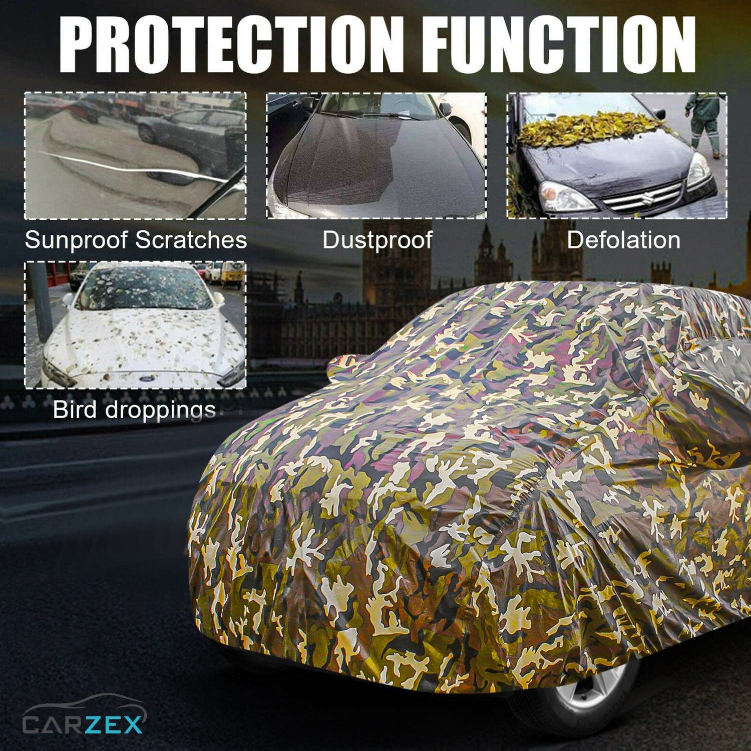 Waterproof Jungle Print Design Car Body Cover made by High-Quality Imported America Fabric with high thread count, effective and all weather car covers for your vehicle which is heavy Weighted, Custom-fit and long-lasting. We at Carzex not only care about keeping your car safe when not in use but also make you look cool with such stylish car covers. Our Car Cover will be FULL SIZED with FULL BOTTOM ELASTIC, 2 MIRROR POCKETS and Proper Belt & Buckle to keep your car safe during winds and from Heat.