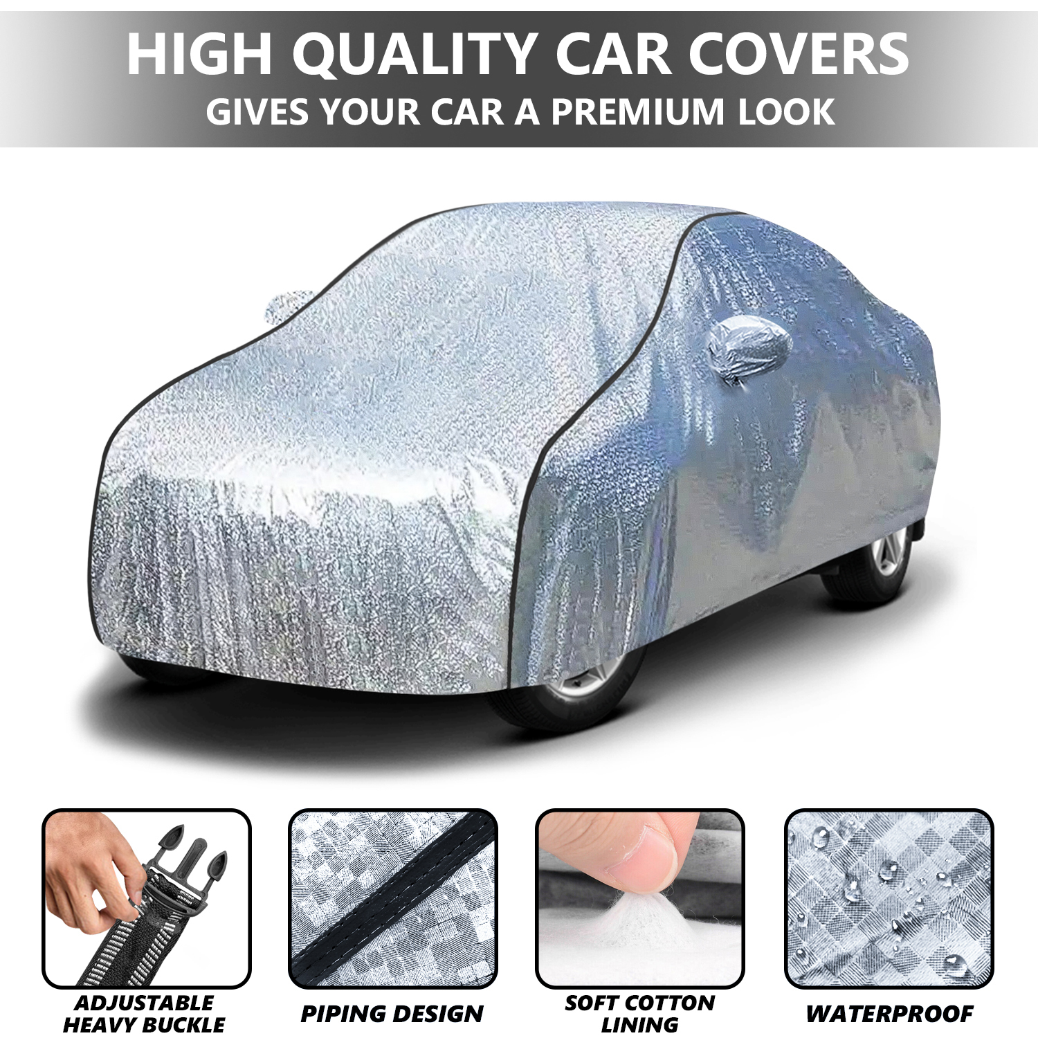• CARZEX brings you Waterproof Metallic Silver With Black Border Car Body Cover made by High-Quality Imported American Design Diamond Silver Color with Black Piping Full Sized Fitting, high thread count, effective and all weather car covers for your vehicle which is heavy Weighted, Custom-fit and long-lasting. We at Carzex not only care about keeping your car safe when not in use but also make you look cool with such stylish car covers. Our Car Cover will be FULL SIZED with FULL BOTTOM ELASTIC, 2 MIRROR POCKETS and Proper Belt & Buckle to keep your car safe during winds and from Heat.Our car cover will help to protect your vehicle from damage caused by